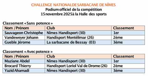 Pour la première fois à Nîmes, le Challenge National de Sarbacane, organisé par Nîmes Handisport, avec le soutien du Comité Départemental Handisport du Gard, s’est tenu le 15 novembre 2025 à la Halle des sports Ludivine Furnon. Deux catégories étaient représentées : « Avec potence » et « Sans potence », réunissant des compétiteurs venus de toute la France dans une ambiance sportive et conviviale. Trois de nos compétiteurs, Abdel, Christophe et Yazid sont sur le podium, rivalisant avec les meilleurs de France. Un grand bravo à Christèle (Non-voyante, malentendante et en fauteuil) qui à atteint les demis-finales.